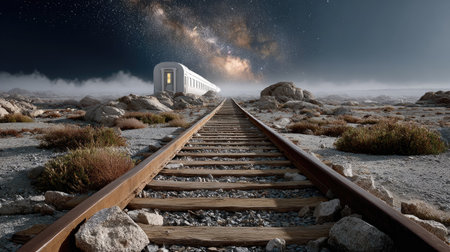 A surreal scene featuring a train station nestled in a desert landscape under a starry sky, evoking feelings of adventure and mystery.