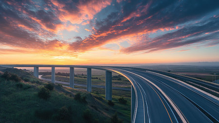A sunset scene on a motorway, with vibrant orange and purple skies illuminating the road as vehicles travel in both directions, creating a stunning contrast.