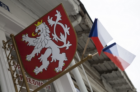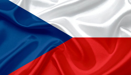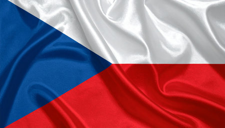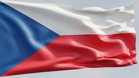 The flag of the Czech Republic, with its white and red horizontal bands and blue triangle, is shown waving gently against a soft, muted sky.