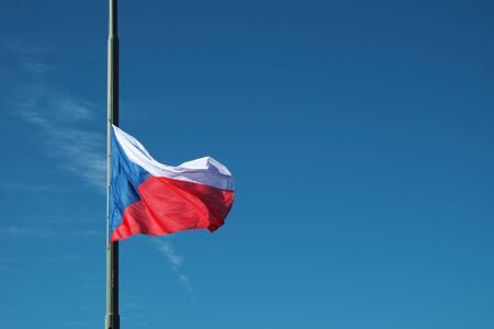 Waving colorful Czech Republic flag on blue sky background. National flag of Czechia. Space for text.