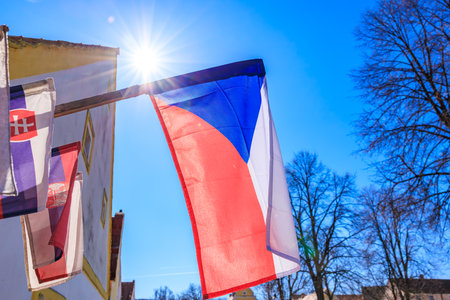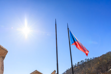 The flag of the Czech Republic on a building with blue sky and the sun in the background.
