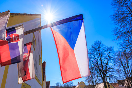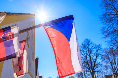 Czech and slovak flags waving under clear blue sky on sunny day.