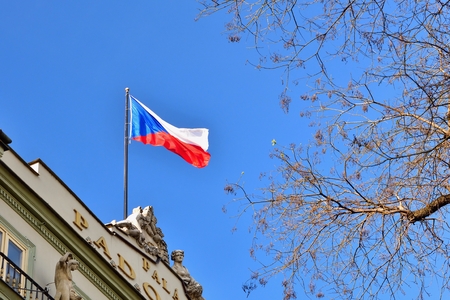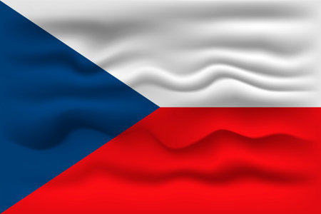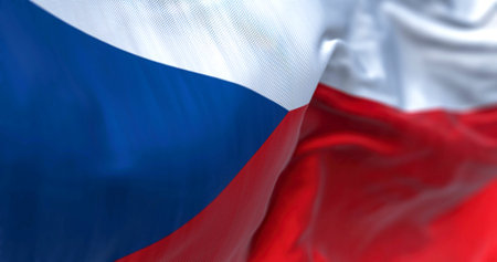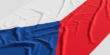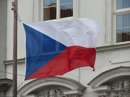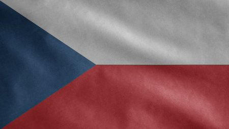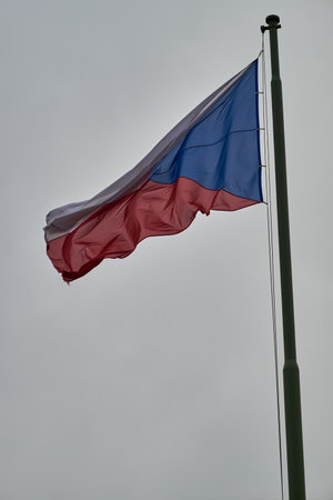 Close-up view of the Czech Republic national flag waving in the wind. Czech republic is a landlocked country in Central Europe. Fabric textured background. Selective focus