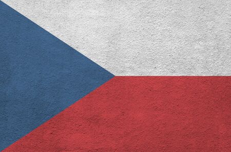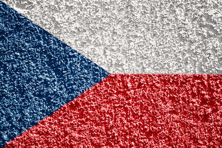 Czech flag depicted in bright paint colors on old relief plastering wall close up. Textured banner on rough background