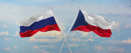 flags of Russia and Czech Republic waving in the wind on flagpoles against sky with clouds on sunny day. Symbolizing relationship, dialog between two countries. 3d illustration,