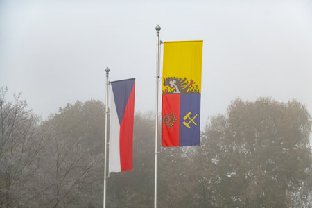 The flags of Czech Republic and Ostrava Poruba city district waving in a breeze in misty weather