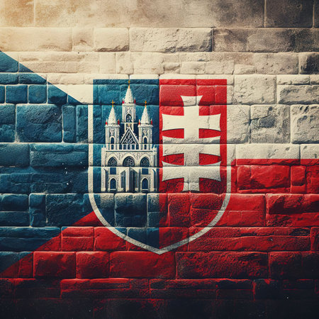 Czech Republic flag overlay on old granite brick and cement wall texture for background use