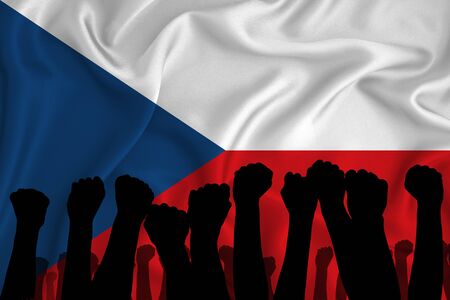 Silhouette of raised arms and clenched fists on the background of the flag of Czech. The concept of power, power, conflict. With place for your text.