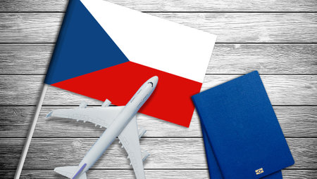 Top view passenger plane on Czech Republic flag with clouds, country tourism banner idea, design, brush splash