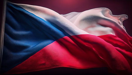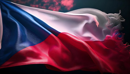Czechia national flag with ripples and shadows on a gradient black backdrop