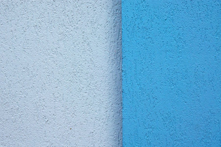 Fragment of the corner of the plastered facade of the building. Converging walls are blue and grey. The surface has a decorative texture. background.