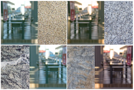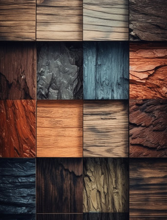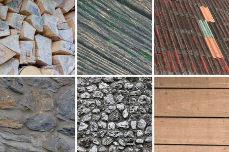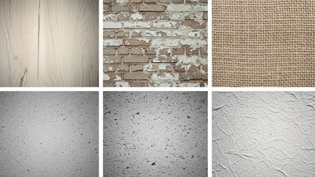 A six-panel collage diverse textures: light wood grain, peeling brick, coarse burlap, speckled concrete, and...