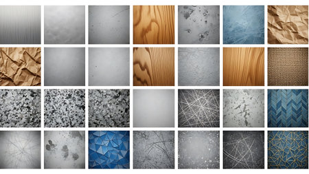 A collage six diverse textured backgrounds: rough leather, woven fabric, speckled paper, wood grain, smooth silk,...