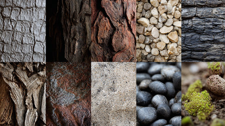 Stylized arrangement of raw surfaces including timber grains, rough stone finish, cork texture and rustic jute cloth useful for product or eco design templates