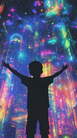 A child's silhouette stands with arms outstretched, marveling at a stunning, brightly illuminated cityscape at night, filled with colorful lights reflecting a sense of wonder.