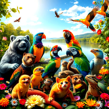 Colorful parrots on the background of the lake and flowers.