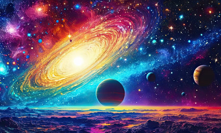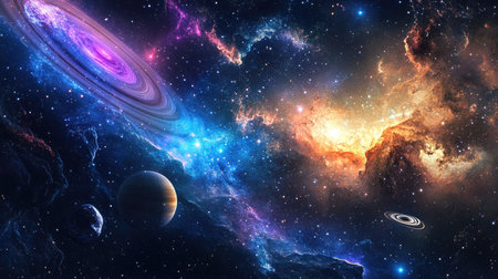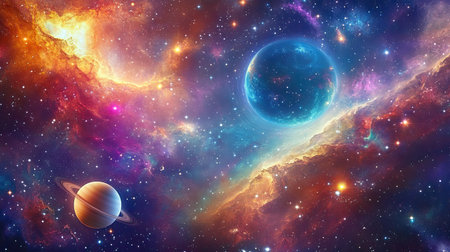 Vibrant cosmic galaxy nebula with glowing stars and distant ringed planets