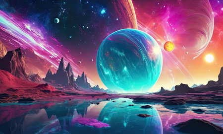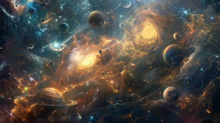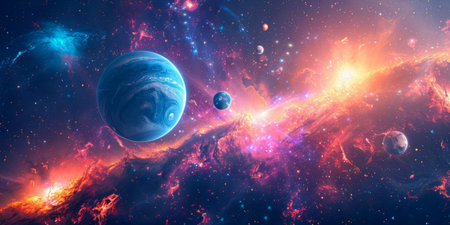 Colorful cosmic landscape featuring vibrant planets and swirling nebulae in deep space
