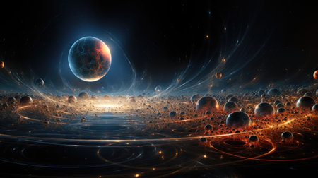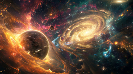 Cosmic ballet of celestial bodies amidst swirling galaxies and starlight backdrop