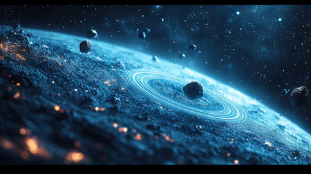 An artistic depiction presents a celestial planet encircled by luminous rings, accompanied by scattered asteroids floating in the vast expanse of space. The predominantly blue and dark tones create a sense of mystery. Ideal for visual media projects or editorial use focusing on space or cosmic themes.