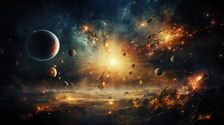 cosmic background with a nebula backdrop, complemented by silhouettes of planets and distant galaxies. Generative AI
