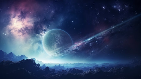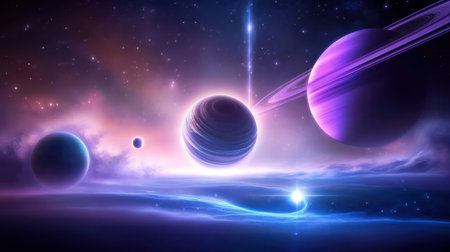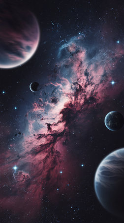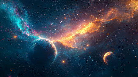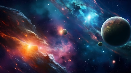 A breathtaking view of outer space with planets and a vibrant nebula. The image captures the beauty of the cosmos, with stars and celestial bodies in the far reaches of space.
