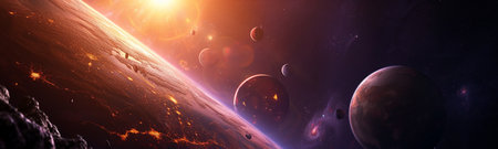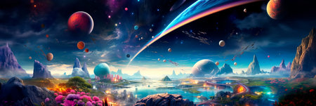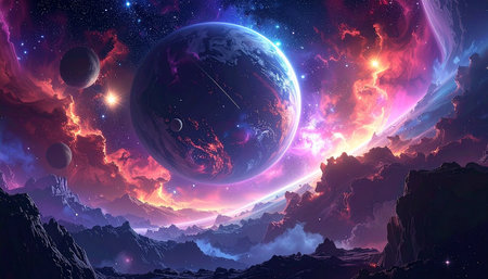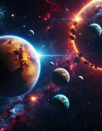 A breathtaking scene of a vast cosmic landscape featuring multiple planets and vibrant nebulae. The image captures the beauty of deep space with vivid colors and rich detail.