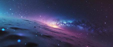 A panoramic view of the Milky Way galaxy, showcasing vibrant colors, sparkling stars, and swirling cosmic dust.