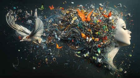 Woman with butterflies and bird flying from hair embracing natures beauty