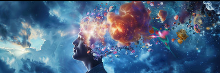 A person envisions a whirlwind of colorful and eclectic ideas bursting from their mind, symbolizing creativity and inspiration against a vivid blue sky.