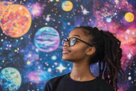 A woman's silhouette stands against a cosmic backdrop filled with planets, stars, and rockets, representing exploration and imagination in a colorful design.