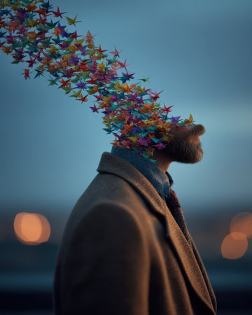 Bearded man with cascade of colorful origami birds streaming from his head. AI-generated.