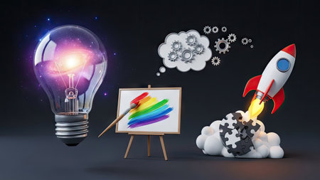 An artistic illustration presents a light bulb, a paintbrush painting a rainbow on a canvas, and a rocket taking off. The composition utilizes vibrant colors and 3D rendering against a dark background, suggesting innovation and creativity. Suitable for conceptual designs that involve ideas, business or technology presentations.