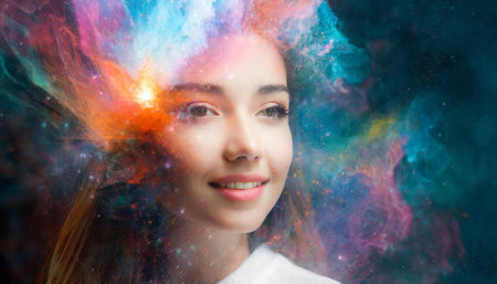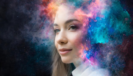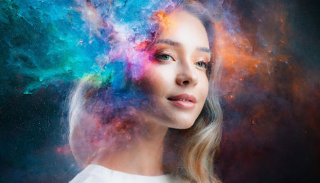 A captivating visualization of a woman's face merges with swirling galaxies, accentuated by planets, set against a rich cosmic backdrop. This artwork invites viewers to explore the universe within.
