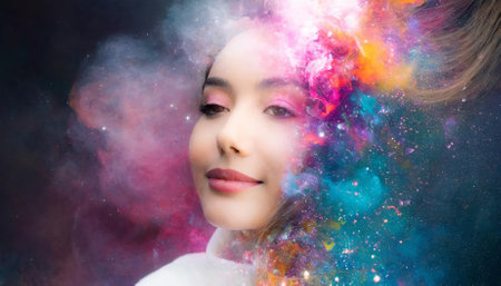 A stunning, surreal fantasy portrait blending ethereal beauty with vivid, colorful digital artistry. The double exposure effect evokes dreamlike wonder, making it truly mesmerizing and