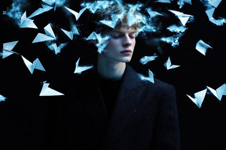 Portrait of a young dreamy man surrounded by floating paper planes, representing aspirations and creativity, in a moody dark setting with blue tones