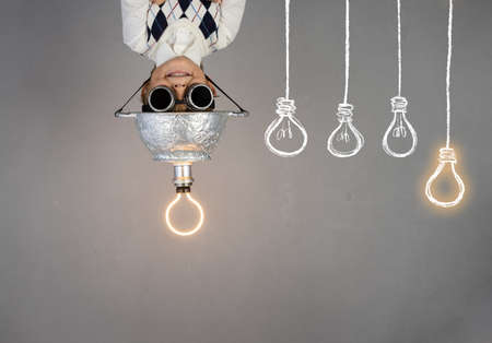 Young man surrounded by flying lightbulbs. Conceptual image.