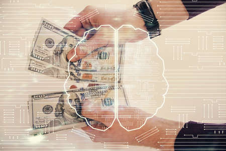 Multi exposure of brain drawing hologram and us dollars bills and man hands. Ai invest concept