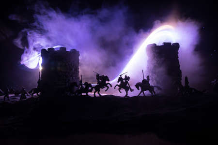 Medieval battle scene with cavalry and infantry. Silhouettes of figures as separate objects, fight between warriors on dark toned foggy background with medieval castle. Selective focus