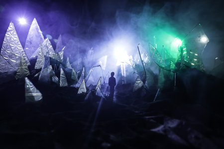 A silhouette of a person against the background of shattered glass. An abstract world made of glass shards. Surreal concept. Table top decoration. Selective focus