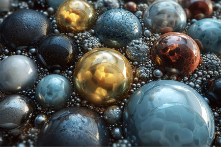 Numerous metallic spheres in varying sizes, colors and textures are visible. Small round shapes create a dense background around the iridescent spheres.