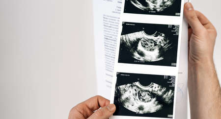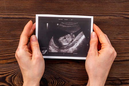 Woman's hands holding ultrasound scan of unborn baby. Pregnancy background