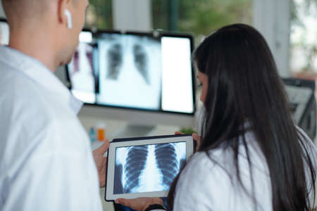 Surgeons discussing chest x-ray of patient with tumor on tablet computer, view from the back