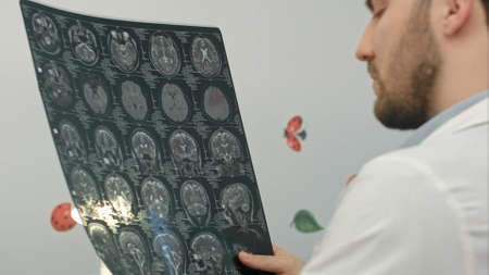 The doctor analyzes an MRI image of the brain.