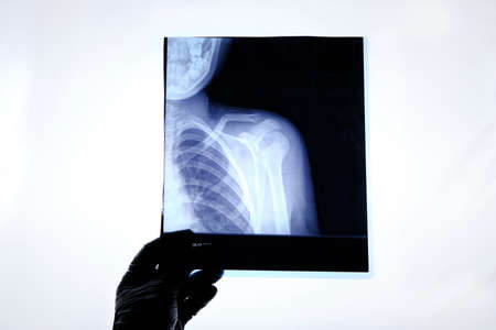 Banner with hand holding shoulder, clavicle X-ray image. Acromion, acromial end fracture. Health care, medical examination, arm injury detection concept. Copy space. High quality photo