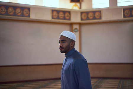 Handsome Younger Muslim Arabic man praying in mosque