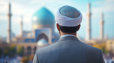 A man stands confidently at dusk, gazing into the distance as the sun sets behind a majestic mosque. The warm colors of the sky create a serene backdrop for his thoughtful expression.