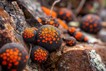 Close-up of vibrant orange-dotted, black fungi clusters nestled on a rocky, weathered surface