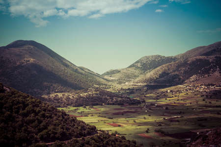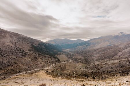Crete Greece, View on mountains with low hanging clouds and blue sky and green trees. South Crete neat Rethymno, Greece