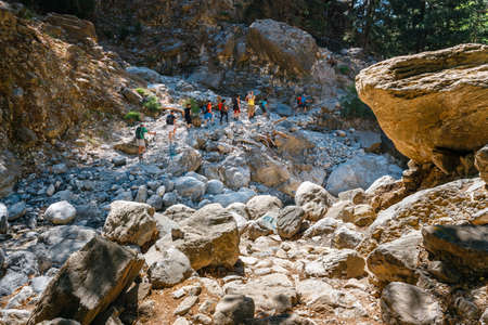Samaria Gorge, Greece - MAY 26, 2016: Tourists hike in Samaria Gorge in central Crete, Greece. The national park is a UNESCO Biosphere Reserve since 1981
